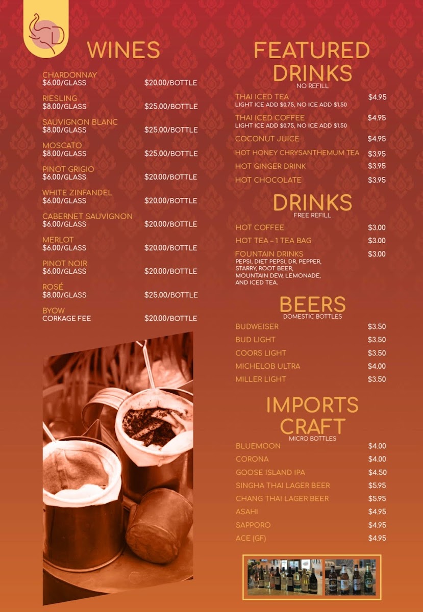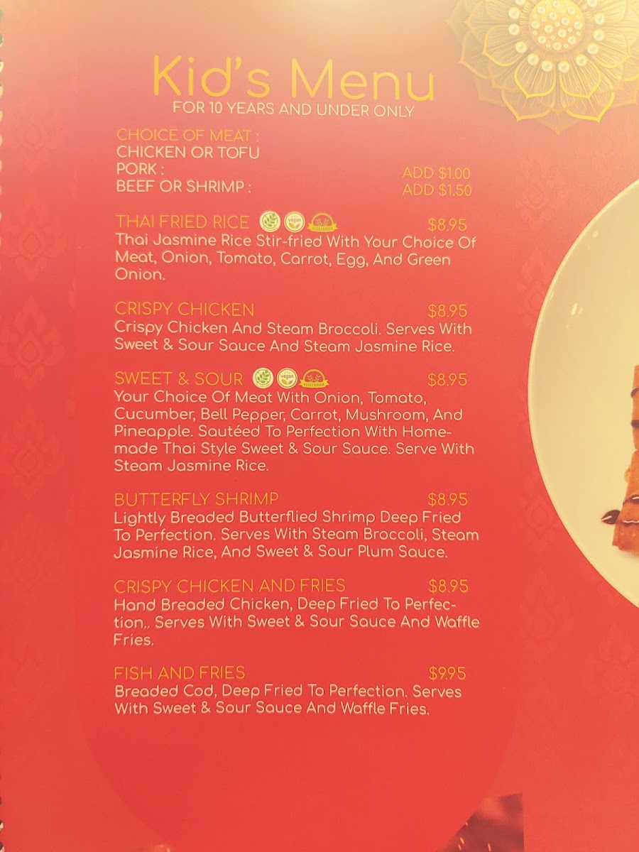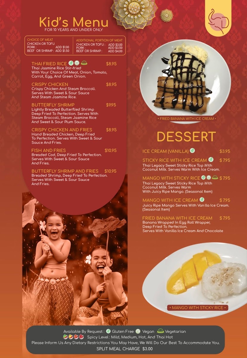 Equally appealing are the rice and noodle dishes, where classics like Thai Fried Rice, Spicy Basil Fried Rice, Green Curry Fried Rice, Pineapple Cashew Fried Rice, and Prik Pow Fried Rice pair perfectly with hearty noodle choices such as Pad Thai D’Lish, Drunken Noodle, Pad Se-Ew, Pad Woon Sen, and Noodle Soup. Lighter choices are not overlooked, with Crispy Tofu Salad, Grilled Chicken Salad Thai Style, and House Salad, alongside comforting soups like Tom Kah Soup and Tom Yum Soup. The Chef’s Special - Tom Saap Nua adds a distinctive highlight for diners seeking something more traditional and bold. Families are well catered to with the kids menu, featuring Kids Butterfly Shrimp, Kids Crispy Chicken, Kids Crispy Chicken and Fries, Kids Fish and Fries, and Kids Thai Fried Rice. Ending the meal on a sweet note is easy with desserts such as Mango with Sticky Rice, Sticky Rice, Cream Puffs, and Crispy Raspberry Dream, complemented by refreshing drinks like Thai Iced Tea, Thai Iced Coffee, Boba Thai Tea, Boba Thai Coffee, and Thai Pink Drink. Overall, the menu at Thai D’lish feels complete and approachable, making it a dependable choice for both first-time visitors and regulars looking for comforting Thai flavors in Quincy.