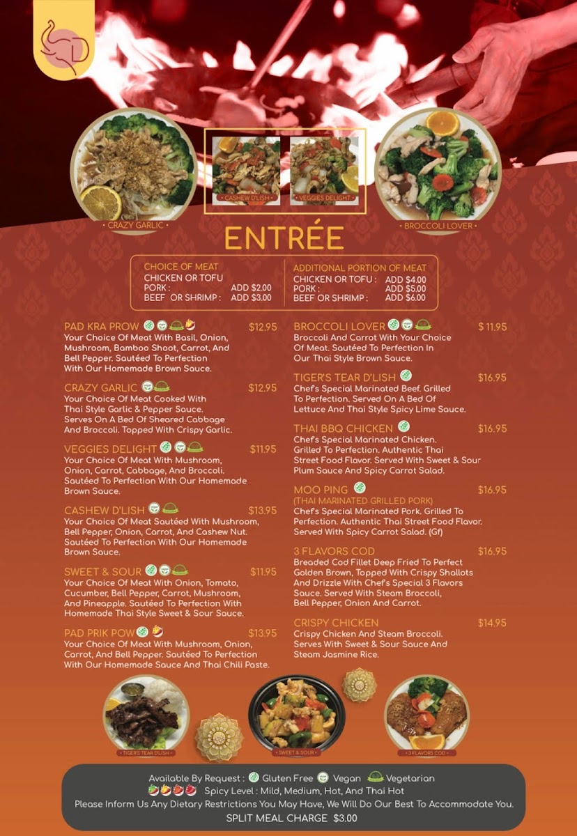 Broccoli and carrot with your choice of meat. Sautéed to perfection in our Thai style brown sauce. *Available by request: Gluten Free, Vegan, Vegetarian.*