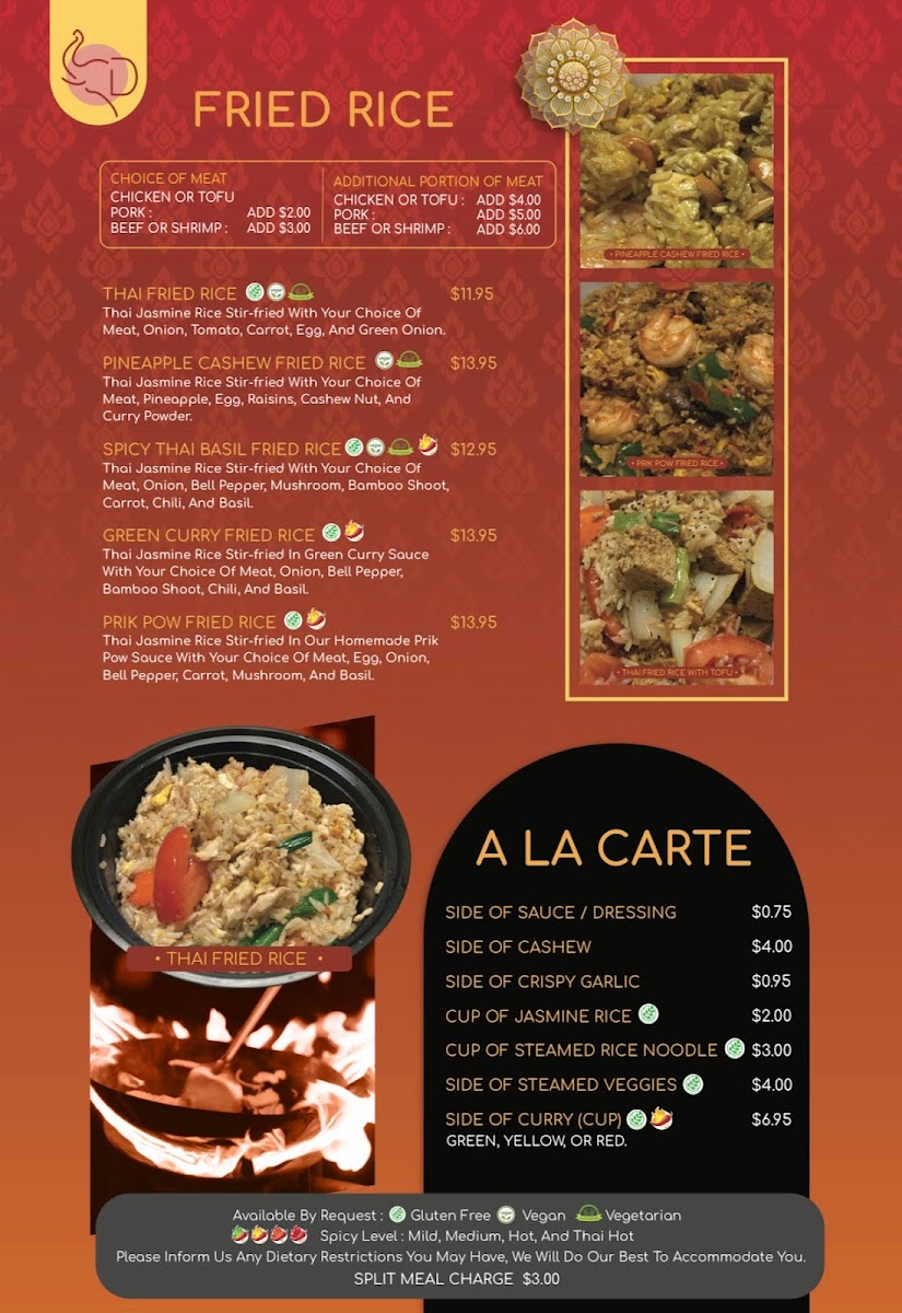 Thai jasmine rice stir-fried with your choice of meat, pineapple, egg, raisins, cashew nut, and curry powder. *Available by request: Gluten Free (without cashew nut), Vegan, Vegetarian.*
