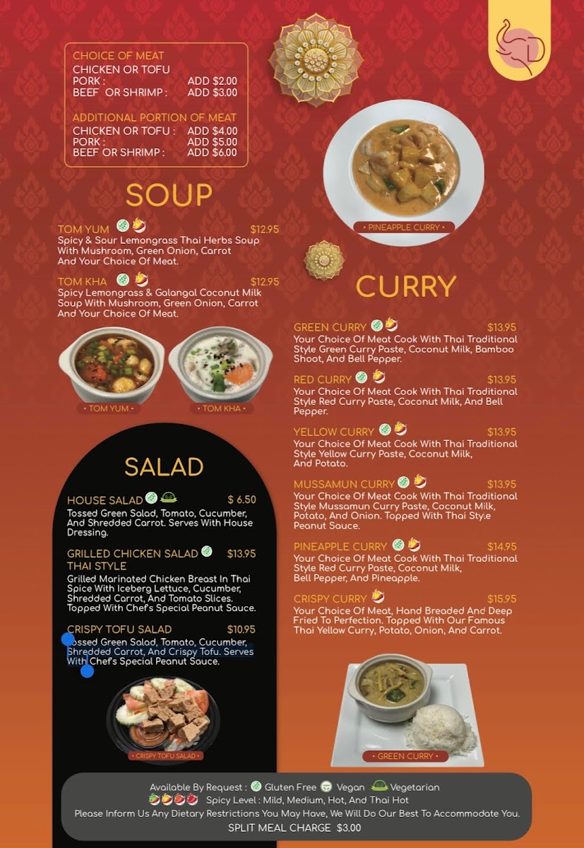 Your choice of meat cook with Thai traditional style Mussamun curry paste, coconut milk, potato, and onion. Topped with Thai style peanut sauce. *Available by request: Gluten Free.*